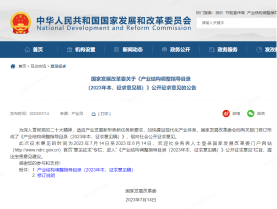 《产业结构调整指导目录》是引导社会投资方向、政府管理投资项目,制定实施财税、信贷、土地、进出口等政策的重要依据。2023年7月14日,国家发改委在其官网发布了《产业结构调整指导目录(2023年本,征求意见稿)》的公告,以向全社会公开征求意见。